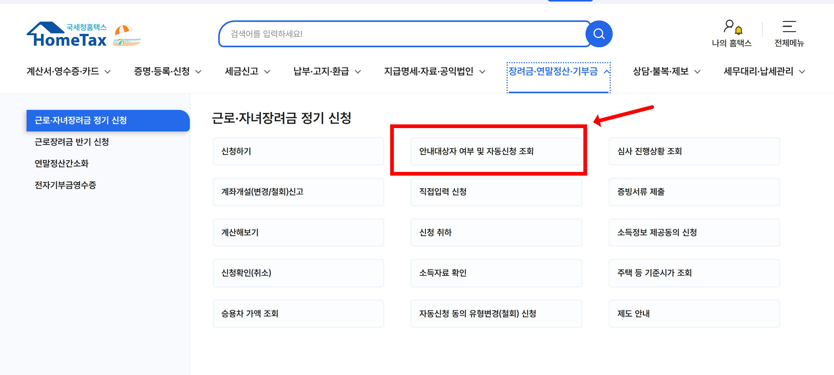 - 전체메뉴 → 장려금.연말정산.기부금 → 근로·자녀장려금 정기(또는 반기)신청 → 안내대상자 여부 및 자동신청 조회