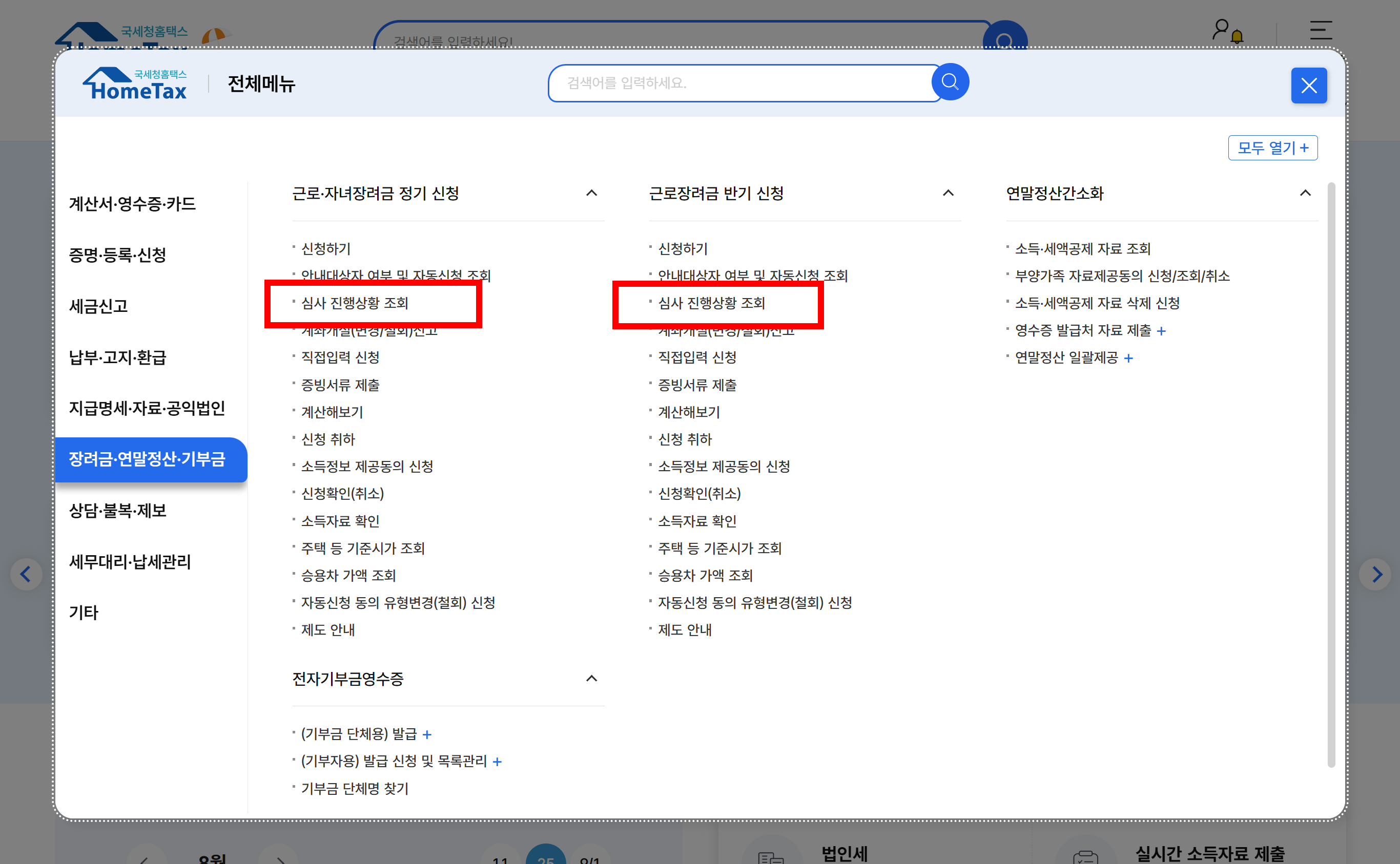 근로·자녀장려금(정기/반기) → 심사진행상황조회
