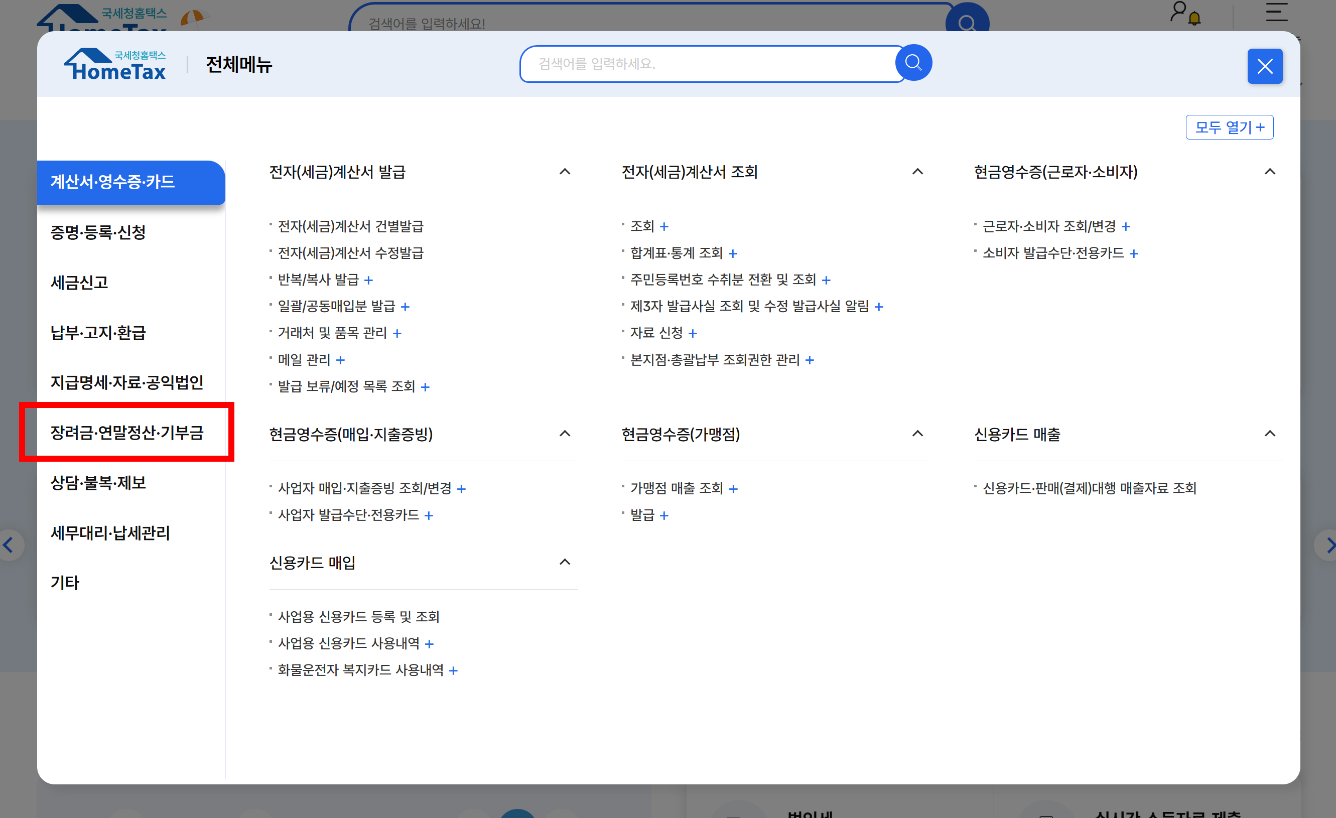 - 로그인 → 장려금·연말정산·전자기부금 메뉴 →